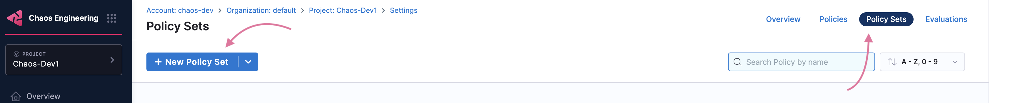 To apply an OPA policy to your pipeline, go to Chaos module -> Project Settings. Under Security and Governance, select Policies.