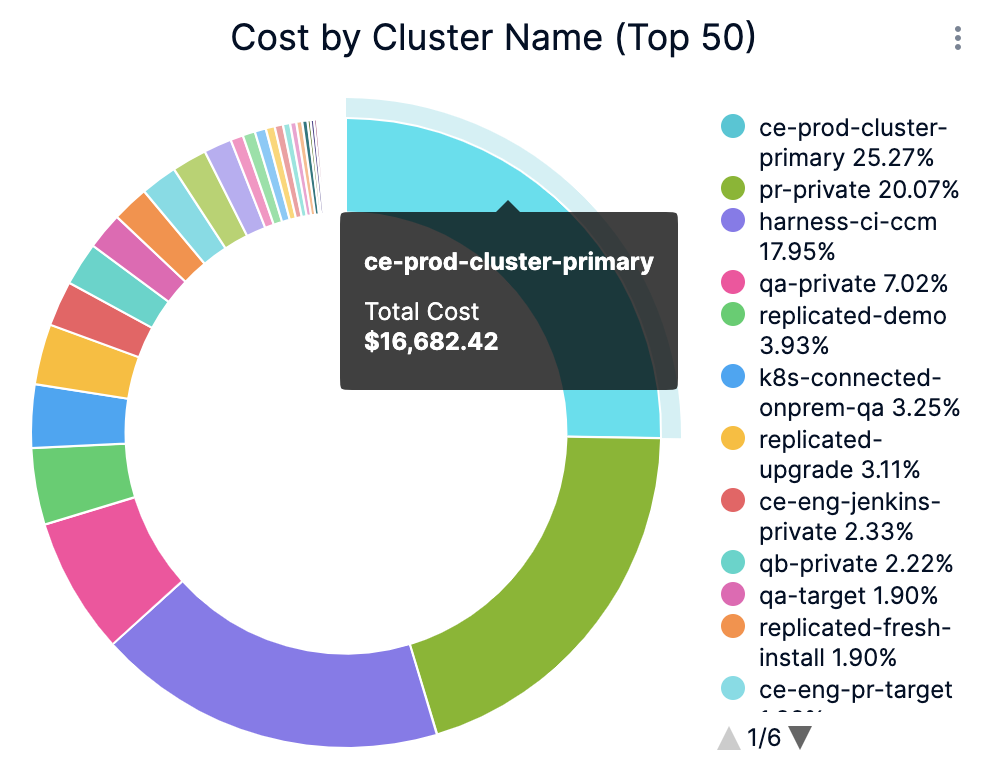 5. In Cost by Cluster Name (Top 50), click the up or down arrow button to scroll up or down the list. The list shows the percentage of each account with respect to the cost contribution.