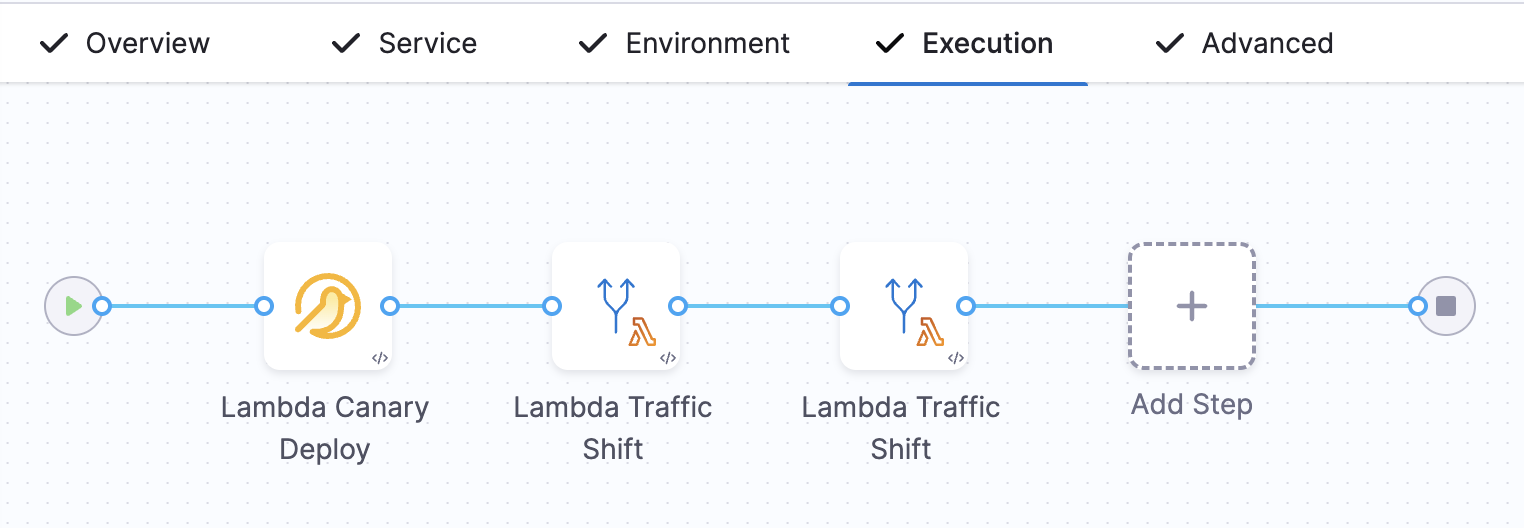 The AWS Canary Deploy strategy enables gradual rollout of a new Lambda version using traffic shifting. When you select the Canary strategy for your AWS Lambda deployment, Harness automatically adds the following execution steps to your pipeline: