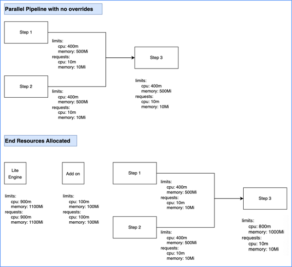 This calculation is for a pipeline that has three steps with resource limit overrides. Two steps run in parallel and one step runs sequentially after the two parallel steps.