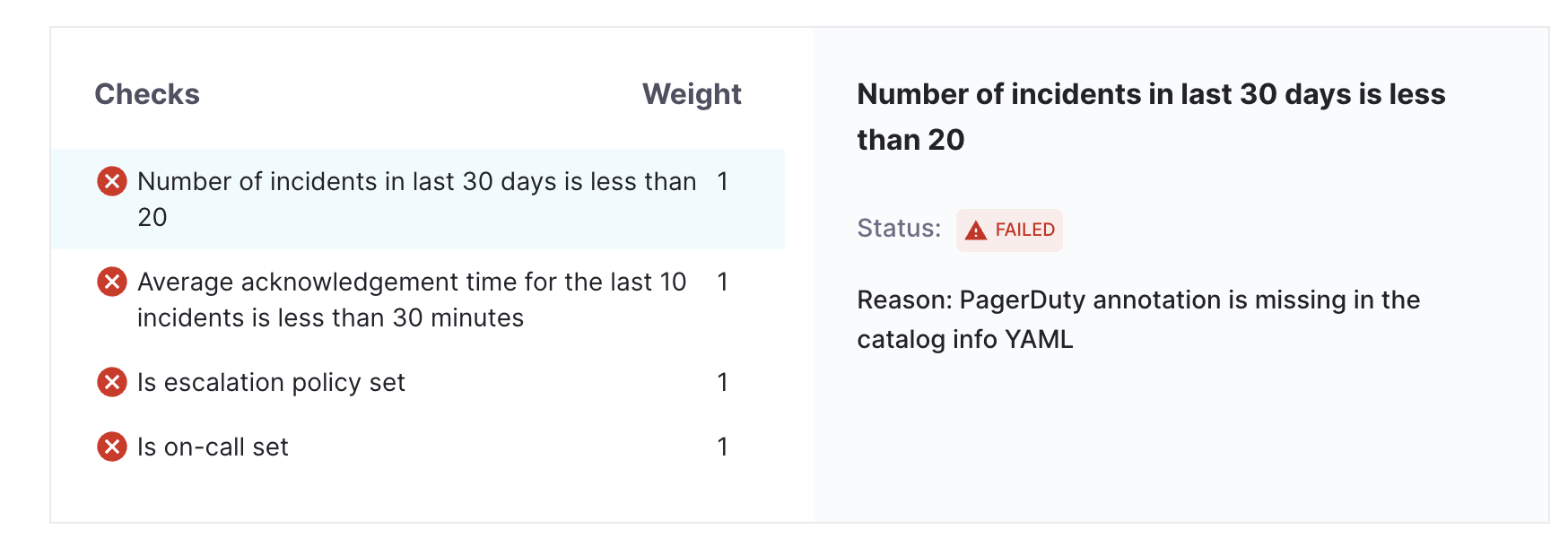 - In case of checks fail because of PagerDuty annotation is missing in catalog info YAML we will get the corresponding error message.