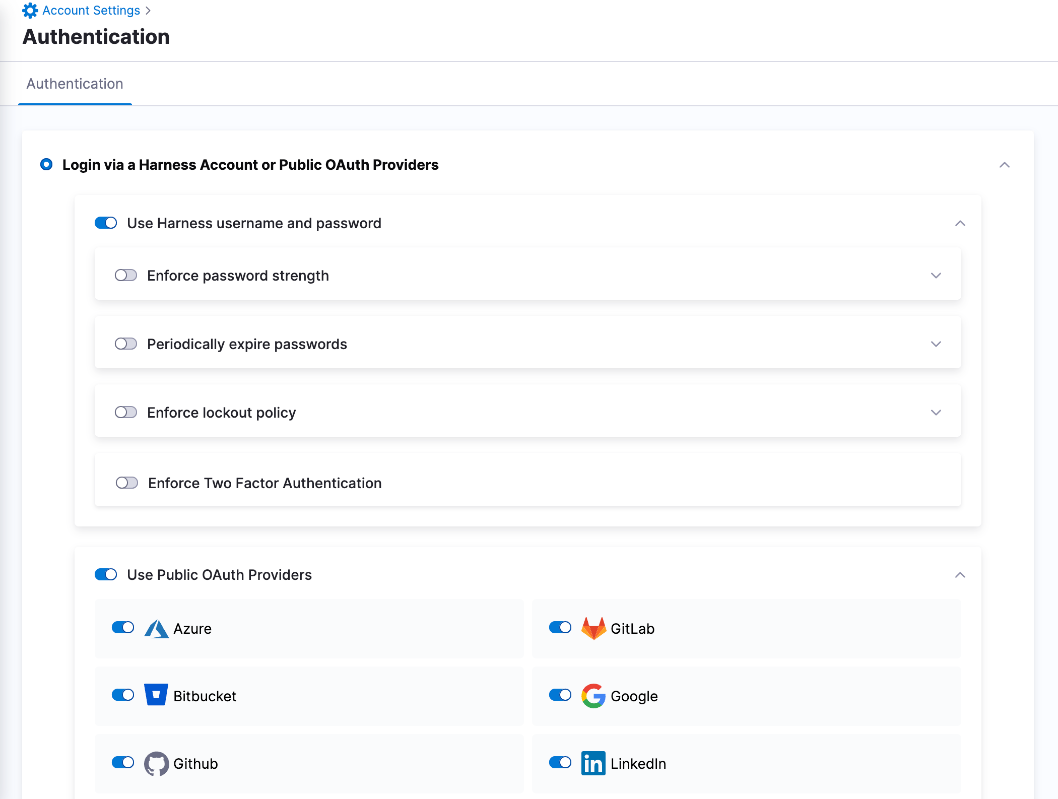 In the Use Public OAuth Providers section, you can enable Harness logins via a range of single sign-on mechanisms. Enable this slider to expose sliders for enabling individual OAuth partners. For more on OAuth Providers, go to Single Sign-On with OAuth.