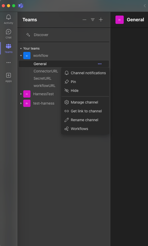 - In Microsoft Teams, right-click the channel name where you want to send notifications, and select Workflows from the menu.