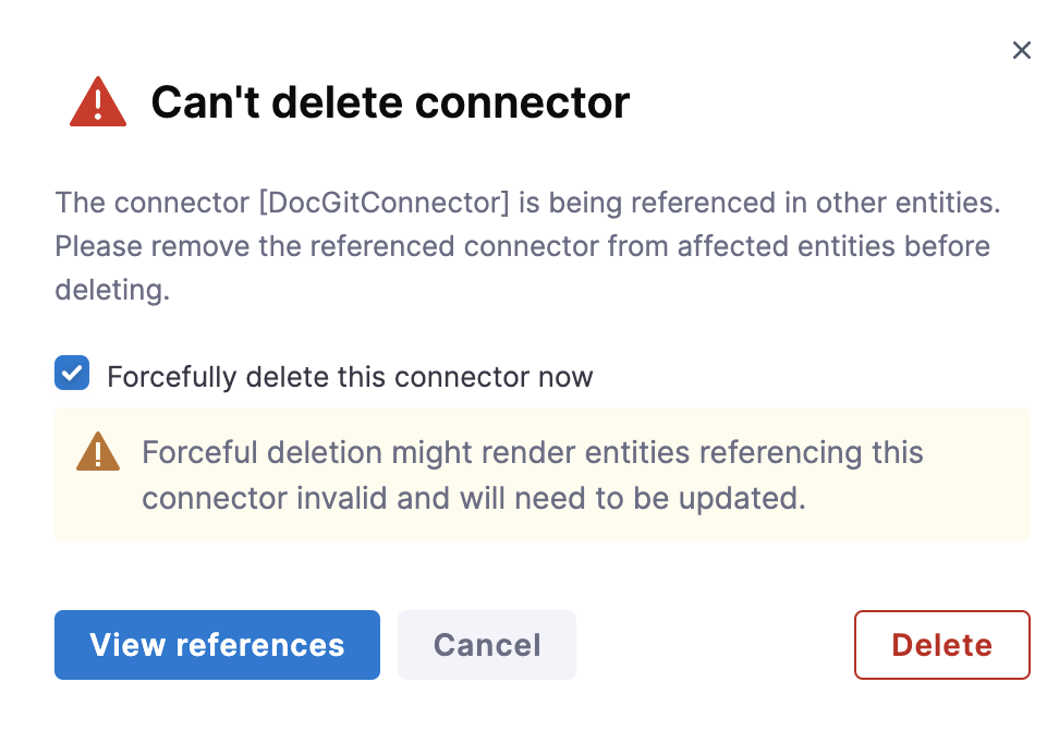 Connector is referenced in Harness entities - If your connector is referenced in a Pipeline or any other Harness entity, you can view the corresponding references or force delete it by selecting Forcefully delete this connector now.