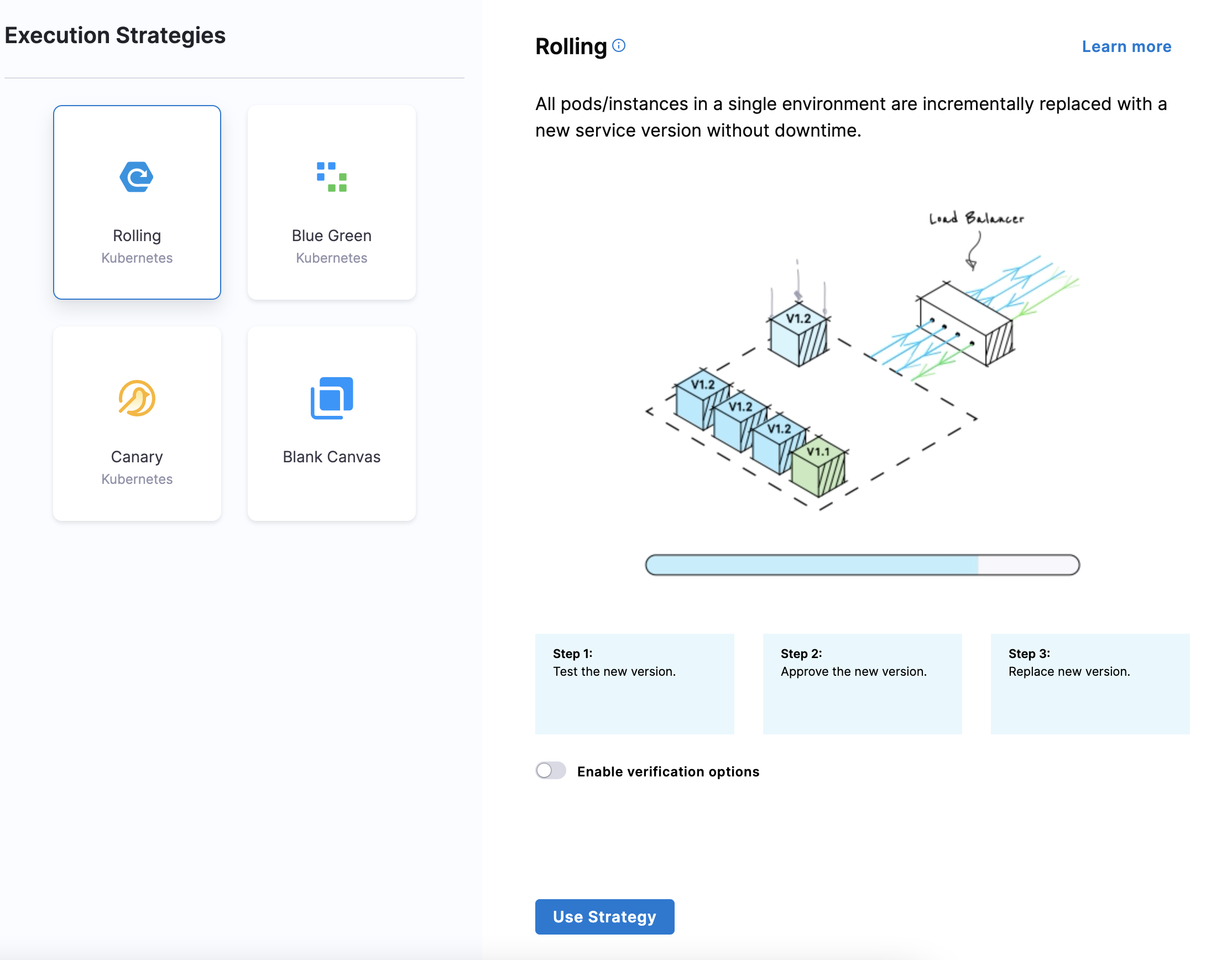 In Execution Strategies, select the deployment strategy for your pipeline template. We've used Rolling in this topic. For more information on different execution strategies, go to Deployment concepts and strategies.
