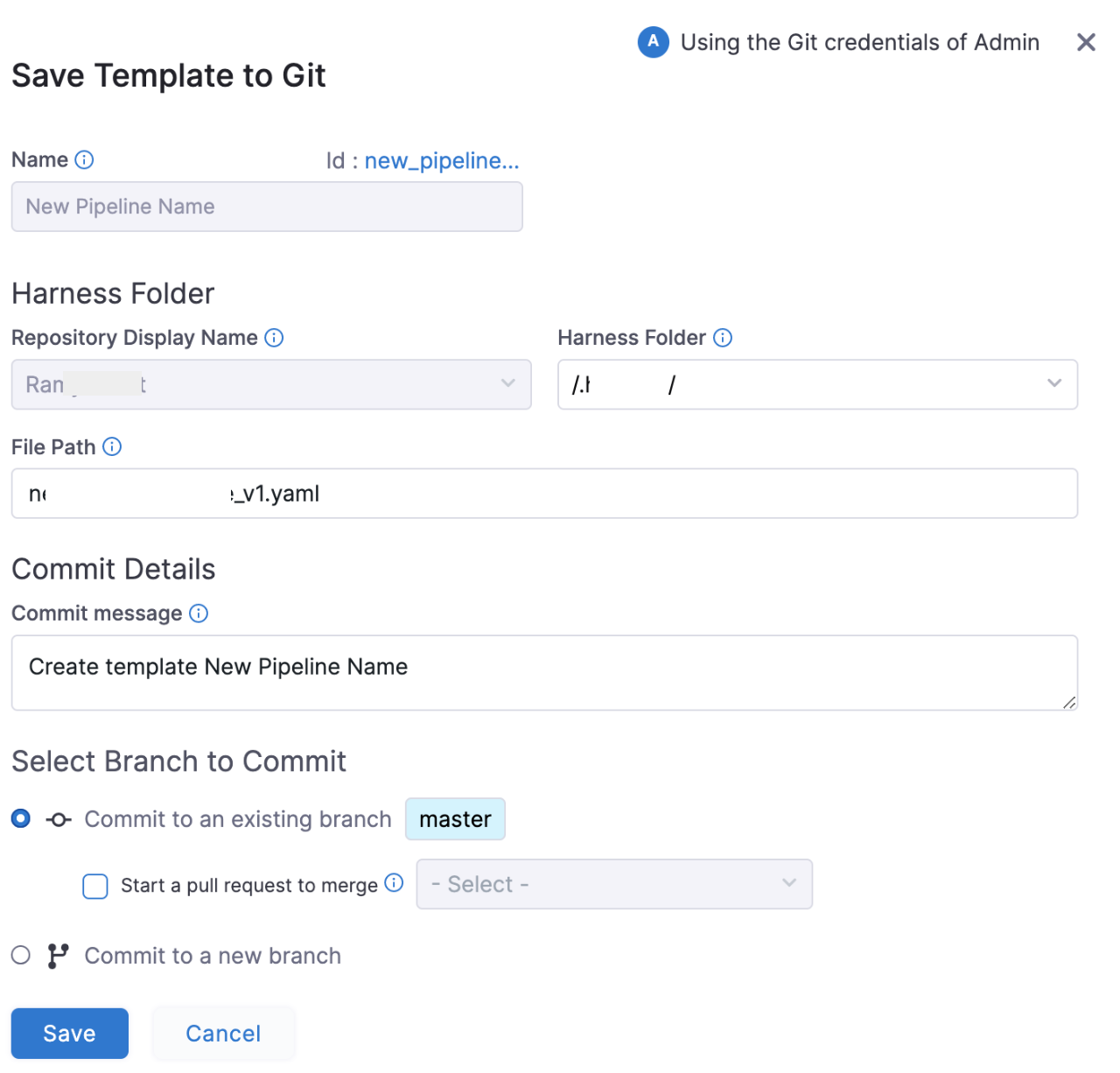 . There are three Save To options that declare the scope where the template is created. - Set up the template to be stored inline (in the Harness Platform) or in a remote Git repo.