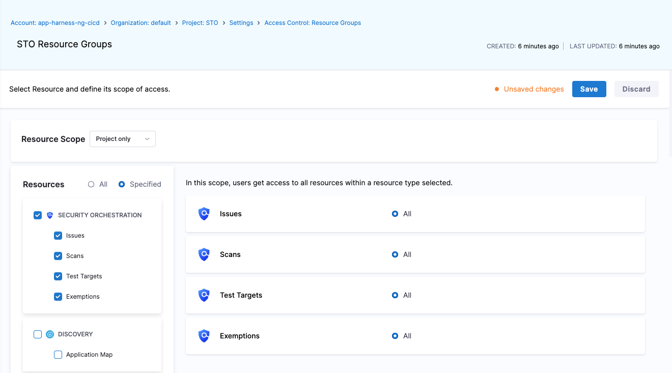 Harness STO offers granular Role-Based Access Control (RBAC) for all its resources. You can precisely control who can view, create, or manage resources across different scopes. RBAC ensures that only authorized users or teams can access or perform actions on critical resources such as Issues, Scans, Exemptions, Test Targets etc. You can configure permissions and resource groups at the Account, Organization, or Project level. For more details on general RBAC setup, refer to the Harness RBAC configuration guide. This document details about: