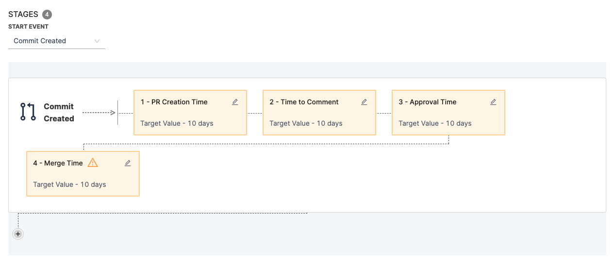 - Review the pre populated Stages that represent the PR lifecycle, from PR creation to merge. You can edit, add, and remove stages as needed. You can edit the data or fields that drive each stage, set time range goals, and more.