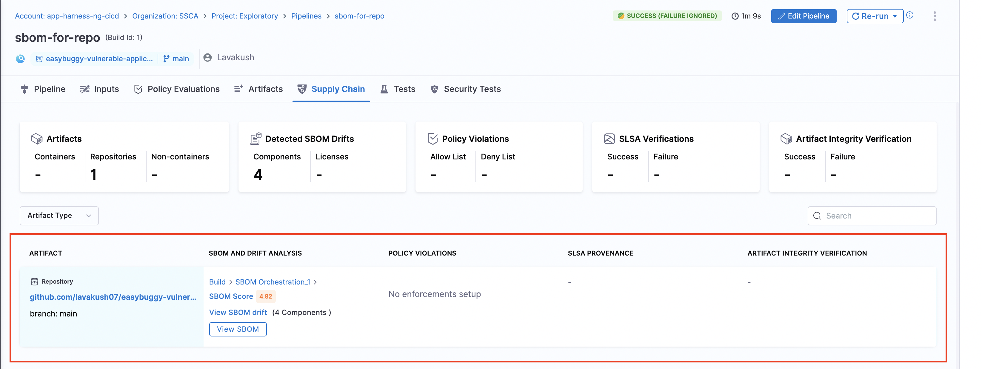 When the pipeline runs, the generated SBOMs for Code Repositories are accessible in the Artifacts view. Additionally, you can locate the SBOM for any artifact on the Supply Chain tab within the Execution Details page in Harness.